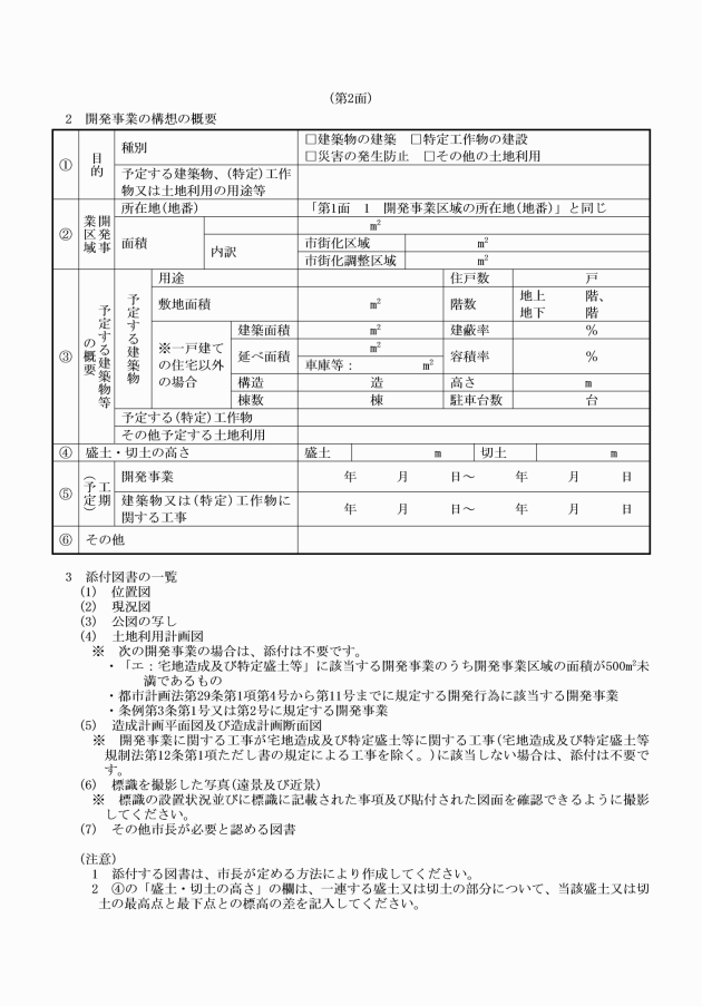 (2) 開発事業(当該開発事業に関する工事が宅地造成等工事規制区域(宅地造成及び特定盛土等規制法(昭和36年法律第191号。以下「盛土規制法」という。)第10条第1項に規定する宅地造成等工事規制区域をいう。)における宅地造成又は特定盛土等に関する工事(盛土規制法第12条第1項ただし書に規定する工事に該当するものを除く。)に該当するものに限る。) 造成計画平面図