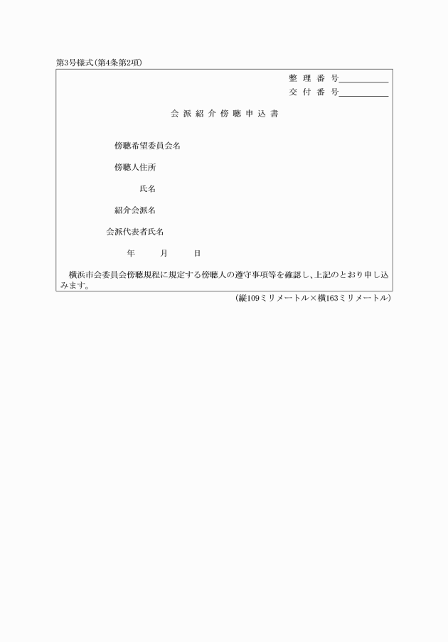 2 前項の規定にかかわらず、会派からの紹介により傍聴しようとする者は、会派紹介傍聴申込書(第3号様式)に住所、氏名その他必要な事項を記載し、傍聴しようとする委員会の開催予定日の前日(その日が横浜市の休日を定める条例(平成3年12月横浜市条例第54号)第1条第1項に規定する休日に当たるときは、その前の平日(同項に規定する休日以外の日をいう。))までに会派紹介傍聴証(第4号様式)の交付を受けなければならない。